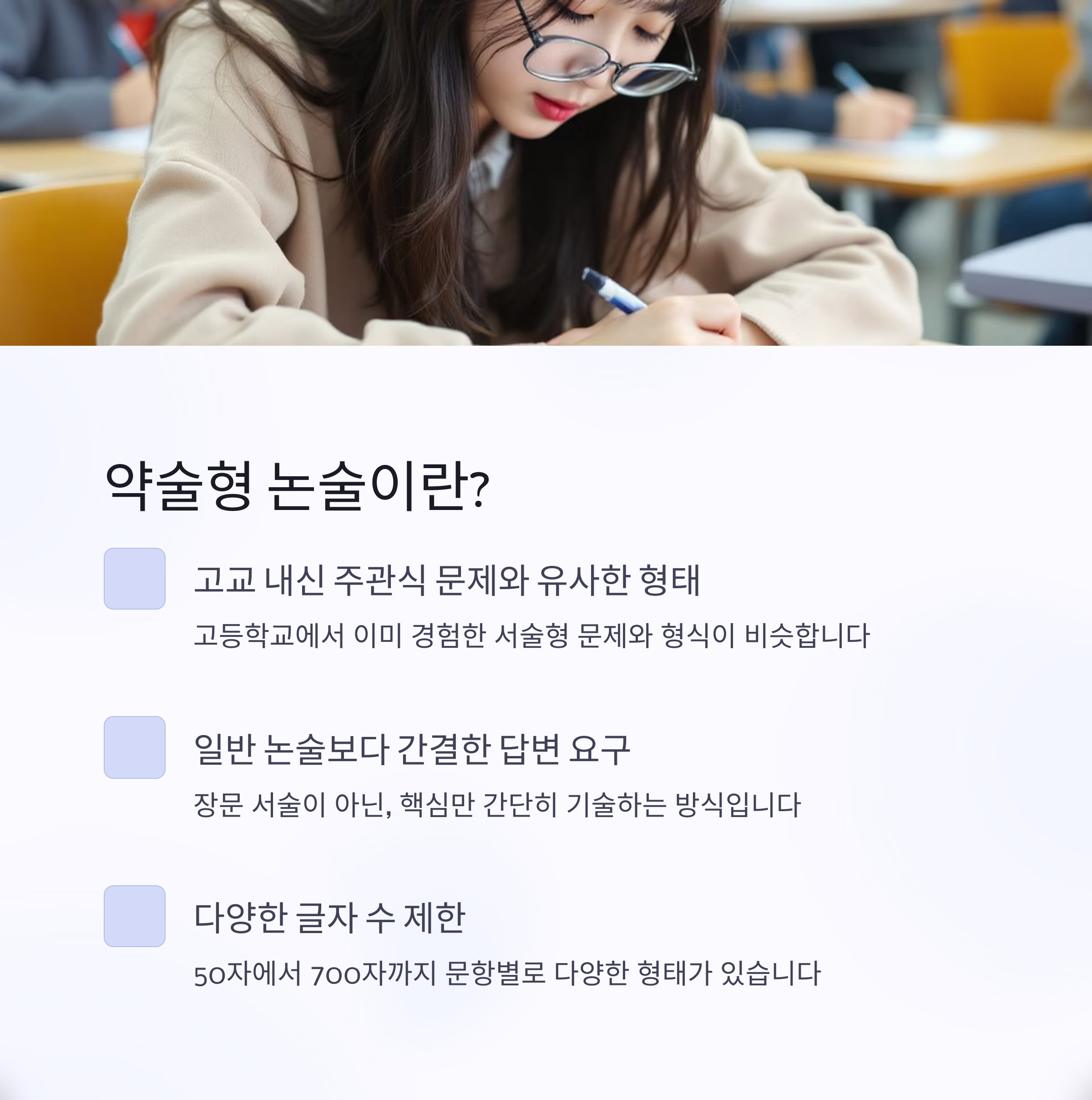 논술형보다 약술형이 정답 범위가 좁아 공정한 평가가 가능하다는 점도 중요한 이유입니다. 대학 측에서도 평가 효율이 높고, 수험생 역시 부담을 줄일 수 있는 방향입니다.