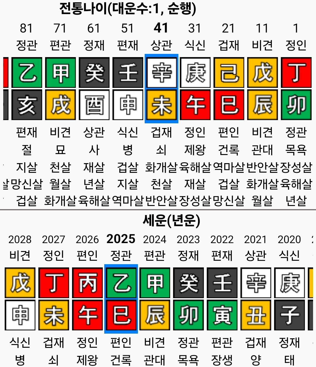 - 현재 대운: 신미 대운 (상관 + 겁재)