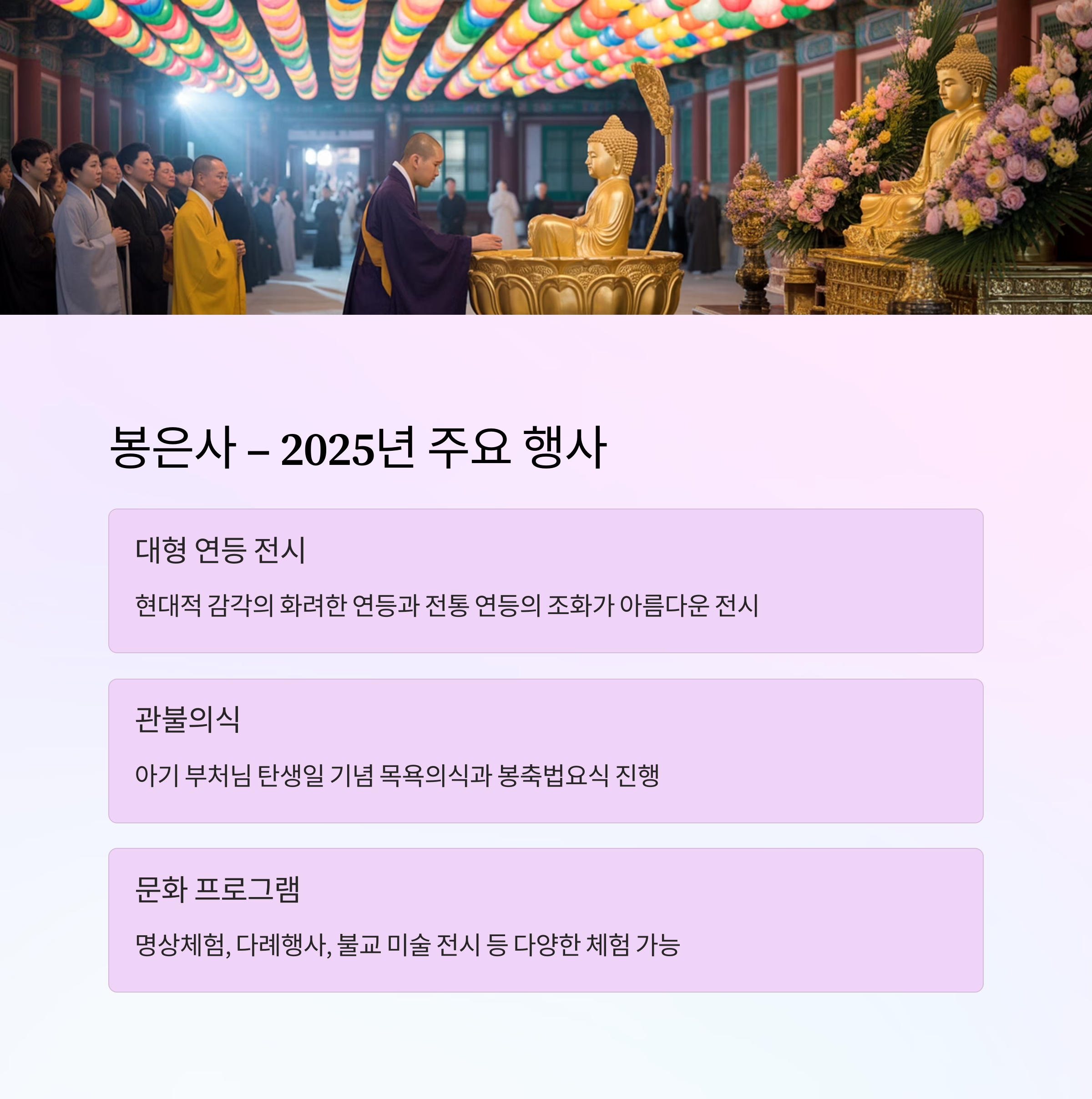 진관사의 자연 속 고요함, 봉은사의 도심 속 불교문화, 용문사의 천년 은행나무가 주는 신비로움… 각 사찰마다 다른 매력이 있으니, 올해는 마음에 드는 한 곳을 골라 방문해 보세요. 분명 오랜 기억에 남을 하루가 될 것입니다. 🙏