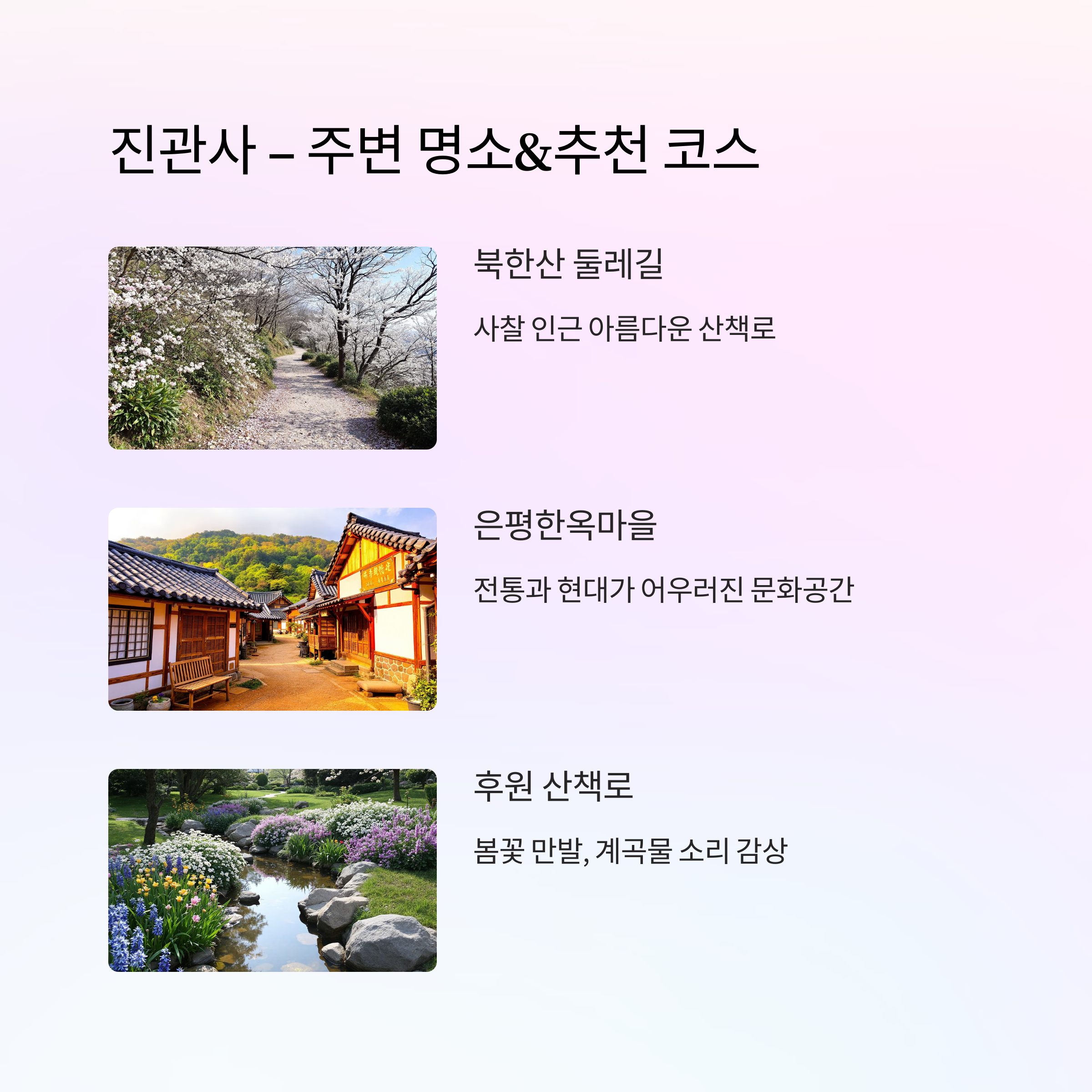 진관사는 조선 초기 창건된 유서 깊은 사찰로, 북한산국립공원 자락에 위치해 자연경관이 아름답기로 유명합니다. 근처에는 은평한옥마을이 있어 전통문화와 자연이 어우러진 하루 코스를 만들기 좋습니다.