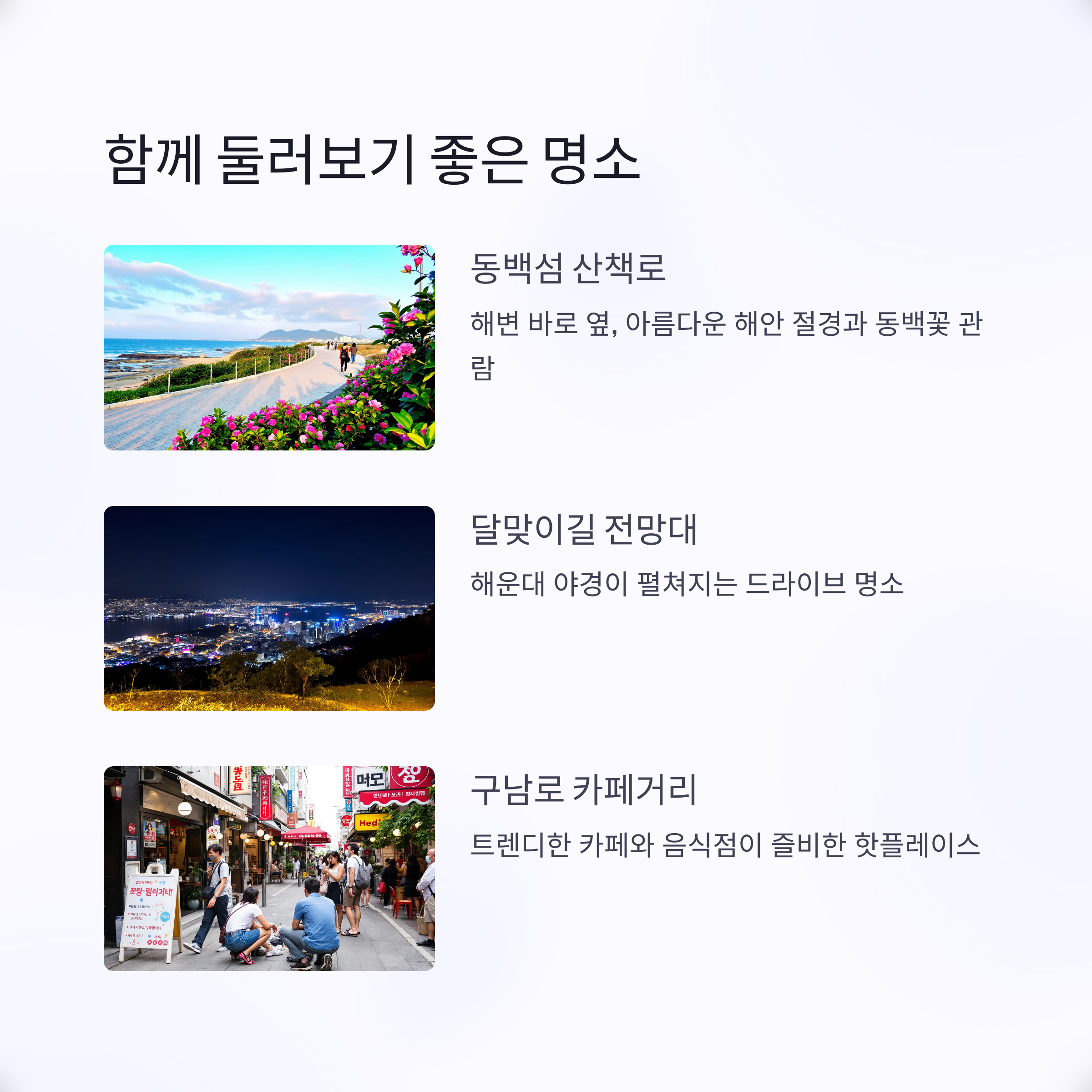 해운대 모래축제를 방문하신다면, 근처의 인기 명소들도 함께 둘러보시면 좋습니다.