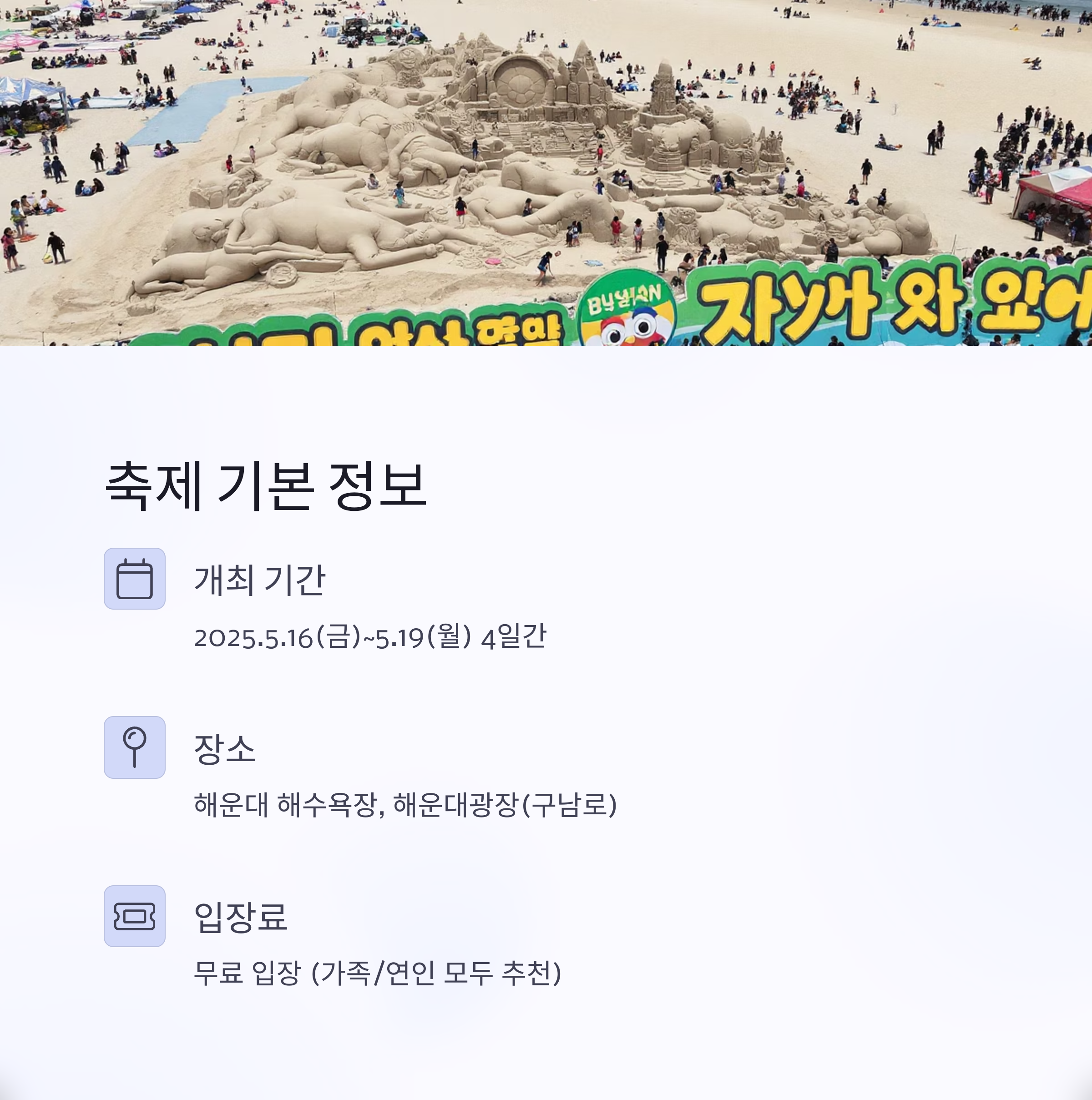 2025년 해운대 모래축제는 모래로 표현된 예술 작품을 감상하고, 다양한 체험을 즐기며 봄날의 추억을 쌓기에 더없이 좋은 축제입니다. 교통편부터 주변 맛집, 포토스팟까지 꼼꼼하게 준비해 방문하시면 더욱 알찬 시간이 될 것입니다. 이번 해운대 모래축제, 가족과 친구들과 함께 잊지 못할 추억을 만들어보세요.