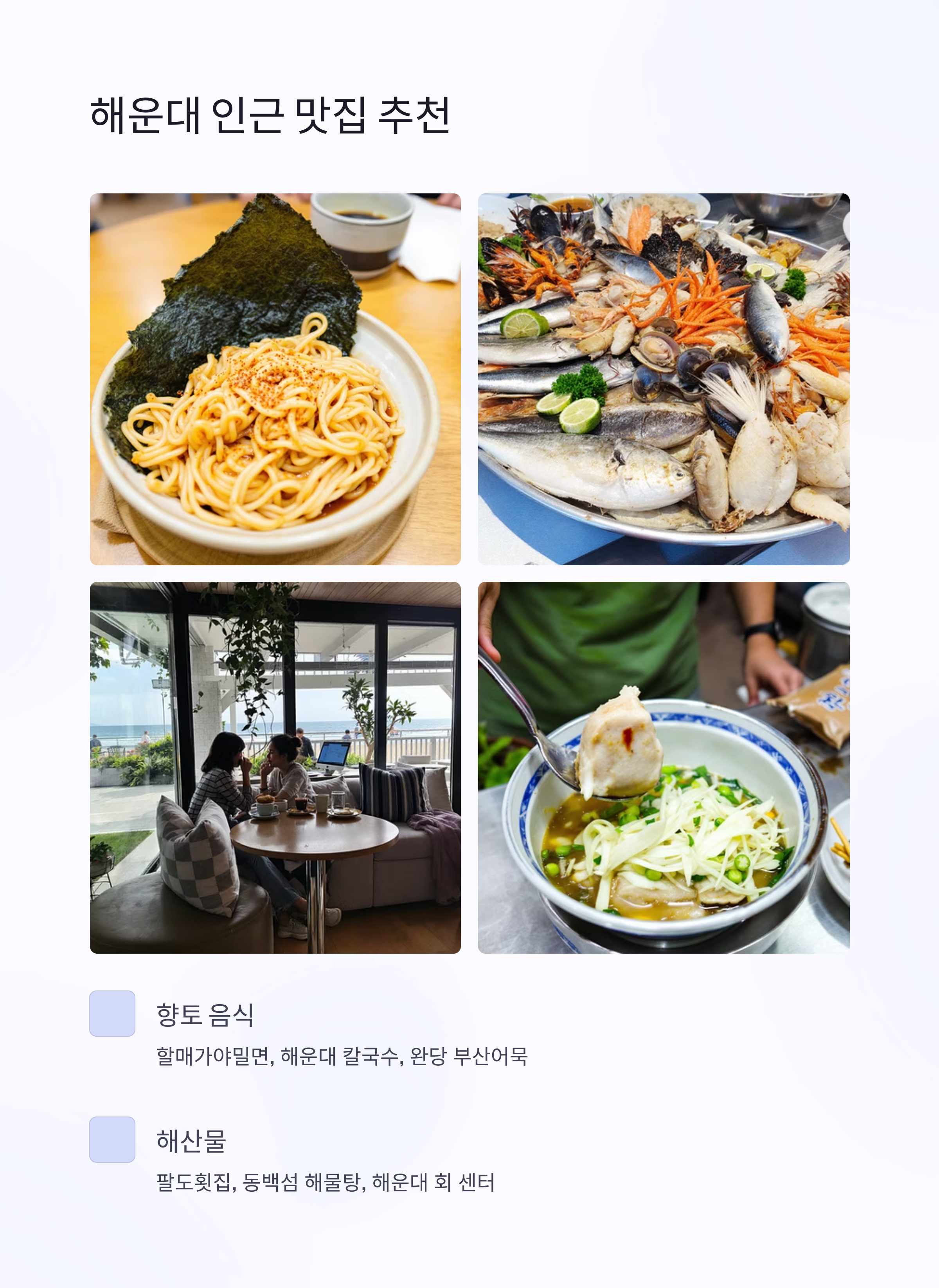해운대 모래축제를 즐긴 후에는 근처 맛집에서 식사를 즐기는 것도 빼놓을 수 없습니다.