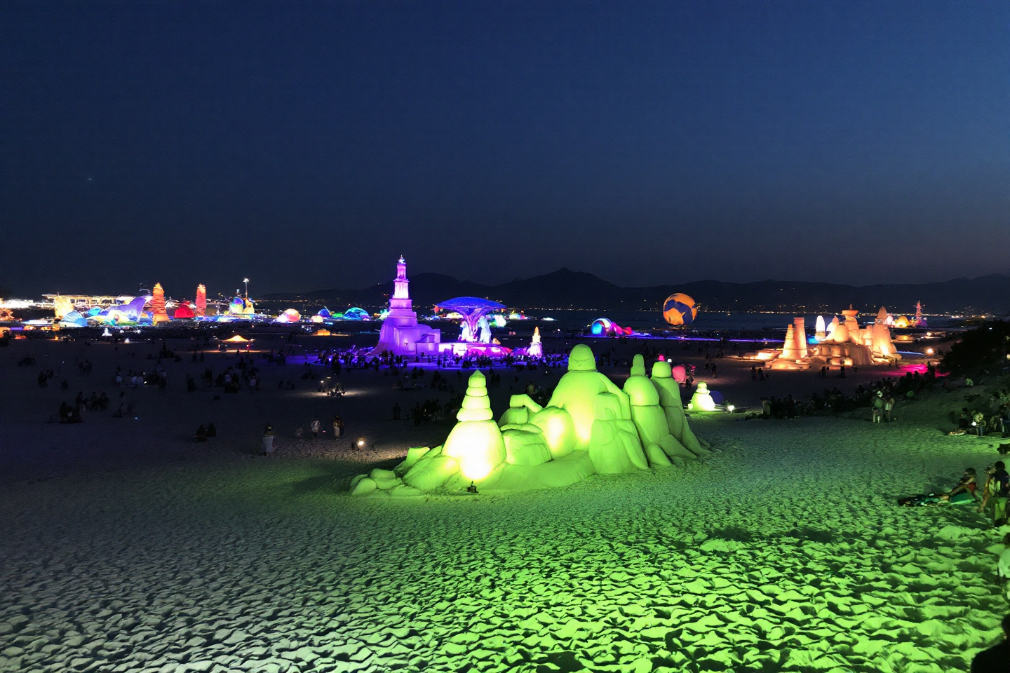 - 백사장 야경: 해질녘 붉게 물든 해변과 조명쇼가 어우러진 모습