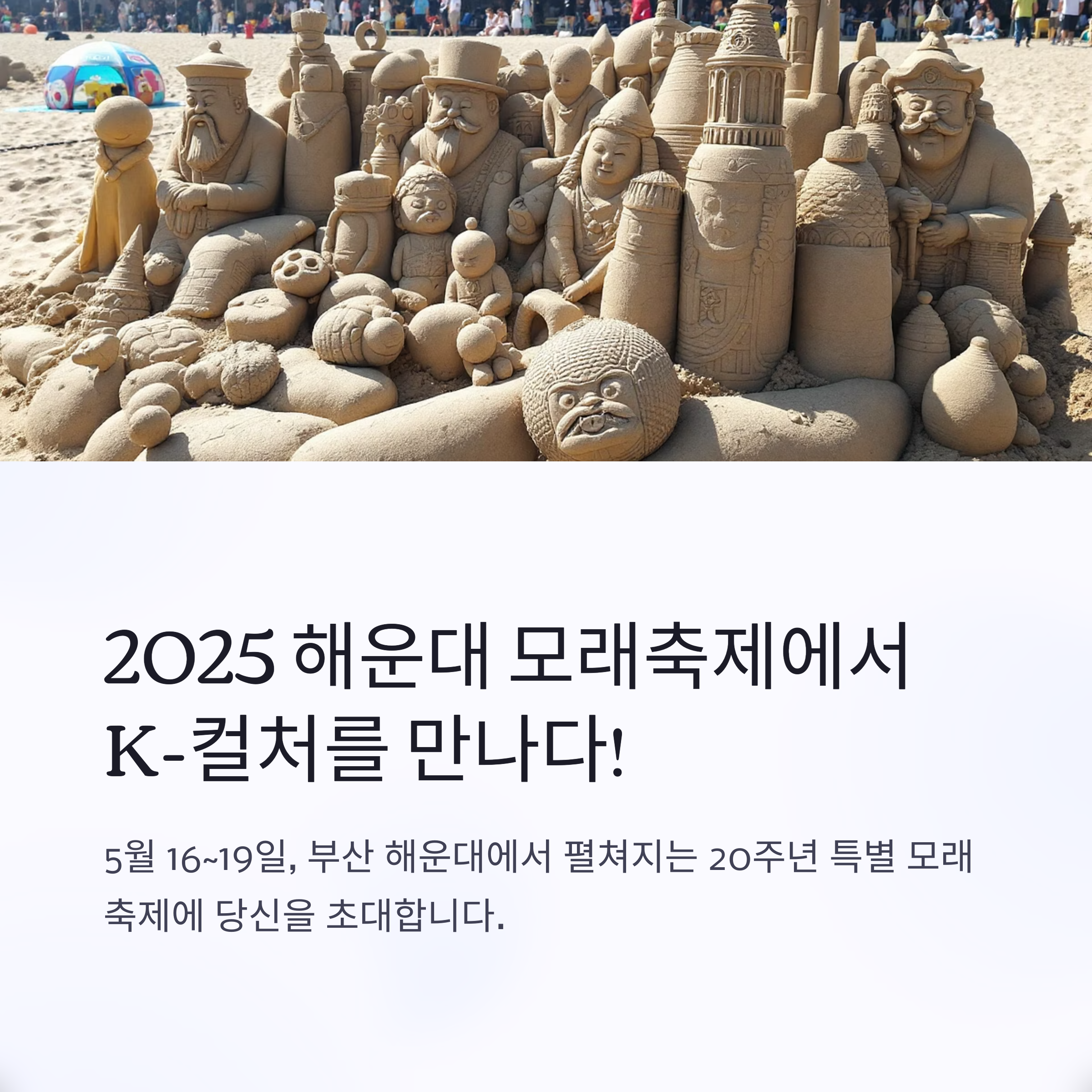 올해로 20주년을 맞이하는 2025년 해운대 모래축제는 5월 16일(금)부터 5월 19일(월)까지 부산의 대표 해수욕장인 해운대 해수욕장에서 개최됩니다. 이번 축제의 테마는 "모래로 그리는 세계 여행"으로, 세계 각국의 랜드마크와 문화적 상징들을 거대한 모래 조각으로 만나볼 수 있습니다.