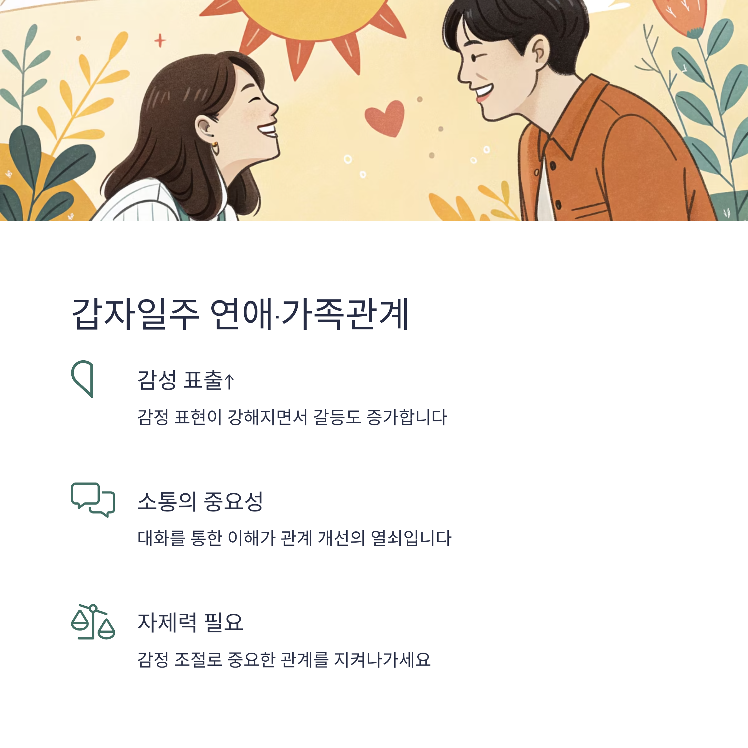 - 미혼자: 더 예뻐지고 싶어지며, 새로운 이성과의 접촉 증가 → 삼각관계 주의