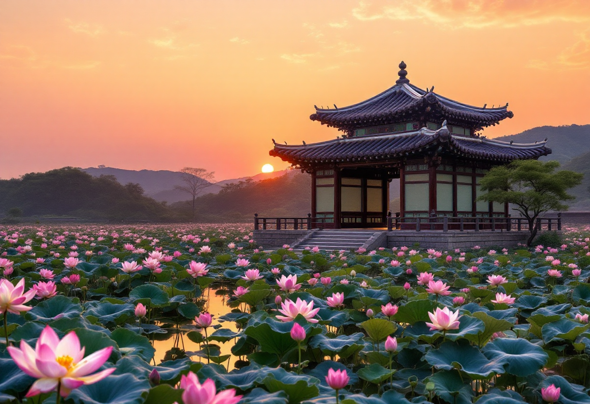 - 연꽃으로 가득 찬 수면 위에 비친 노을 풍경