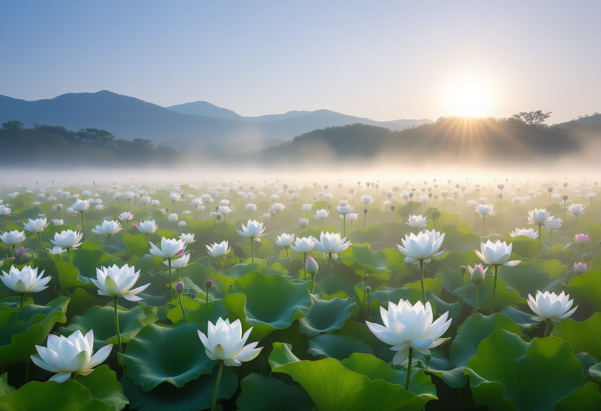 - 이른 아침 물안개와 백련이 어우러지는 순간